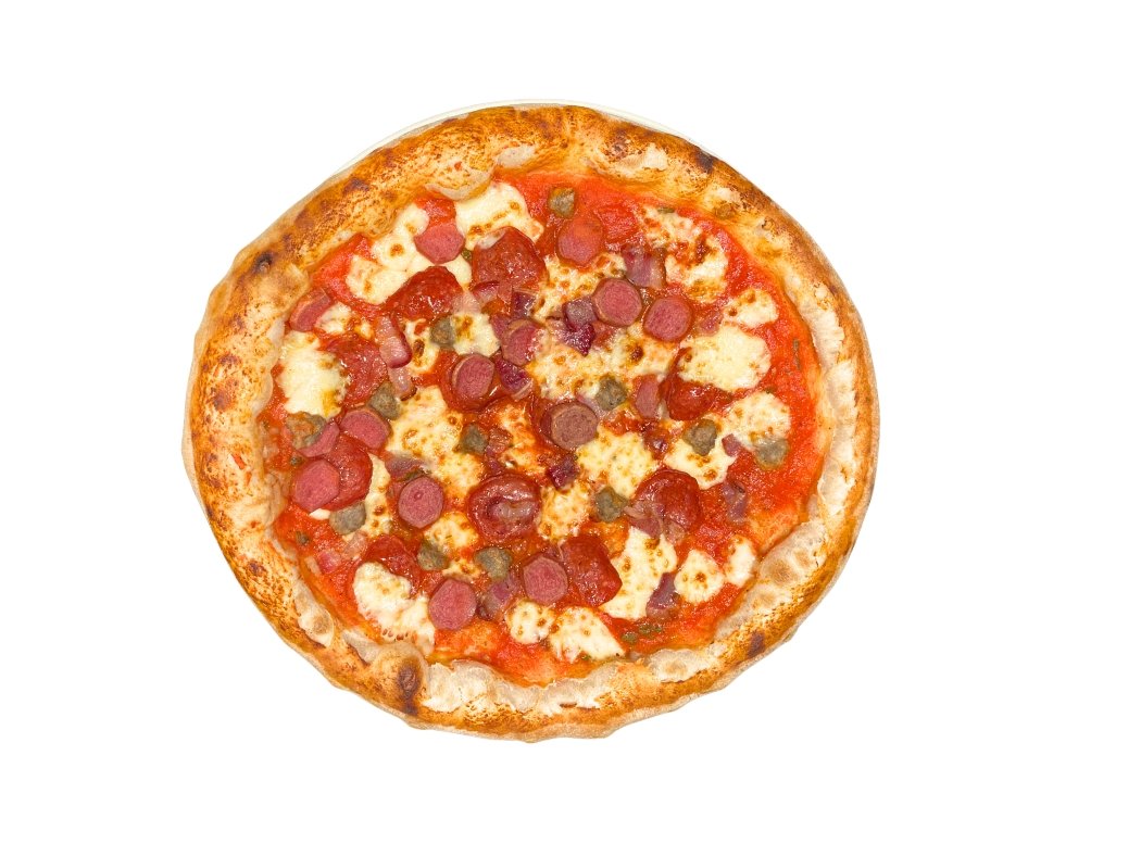 Tomato sauce, mozzarella, oregano, pepperoni, beef, hotdog, beef bacon, and onion
