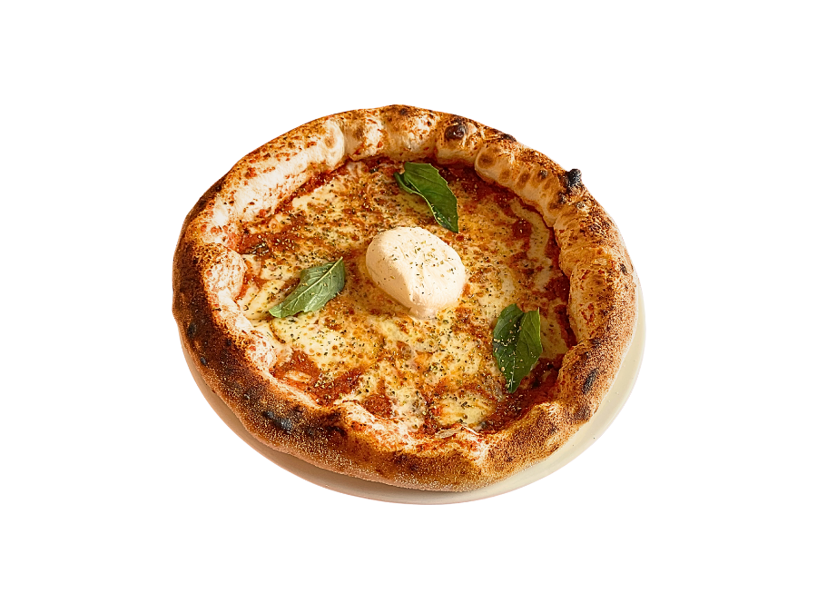 House specialty, brick oven pizza with tomato sauce, basil and topped with half fresh mozzarella buffalo ball
