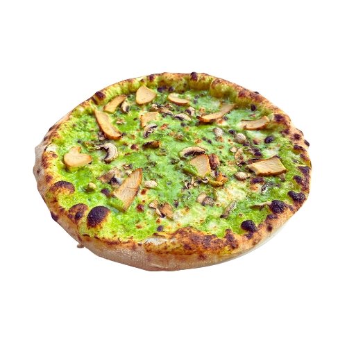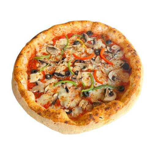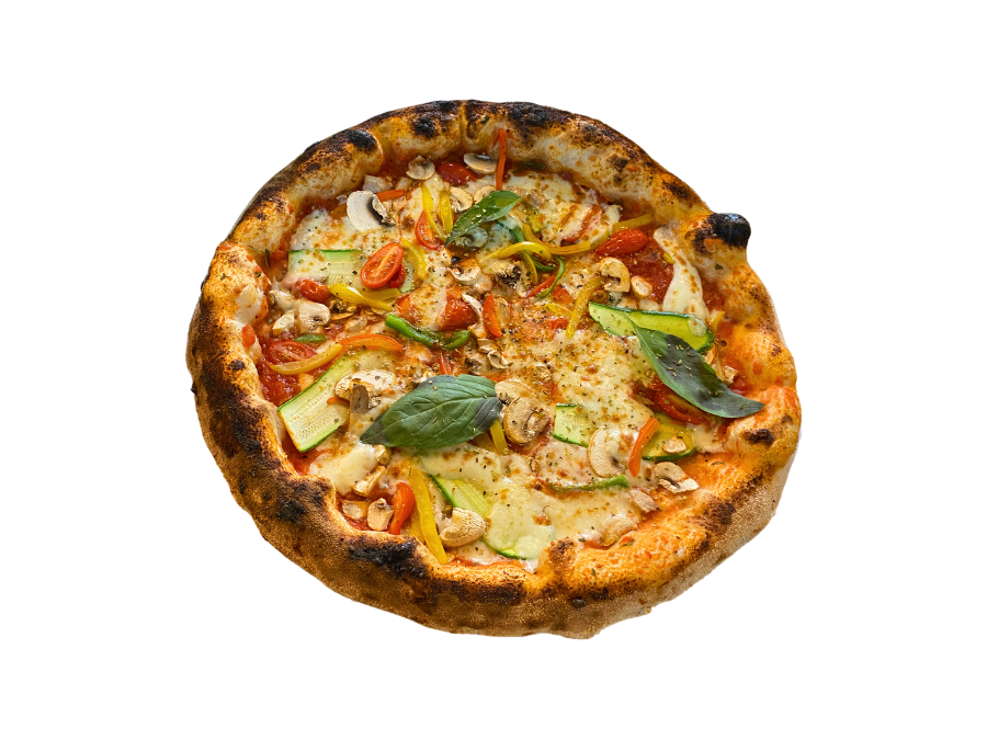 Tomato sauce, Mozzarella, Oregano, Zucchini, Green Peppers, Green Olives and Mushrooms