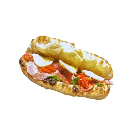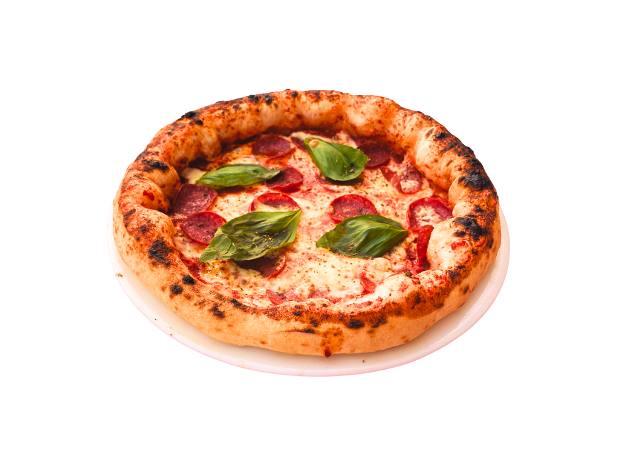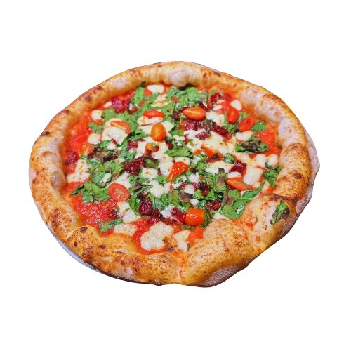 Biga dough Baked and topped with Fresh Sliced Salami & Bologna, Rocca, Cherry tomato and Buffalo Mozzarella, Oregano and Olive Oil.