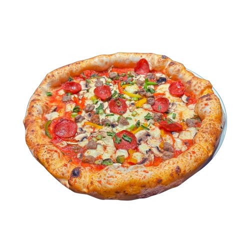 Tomato sauce, mozzarella, Oregano, Pepperoni, Beef, Bell Peppers, Mushroom, Black Olives and Green Onion
