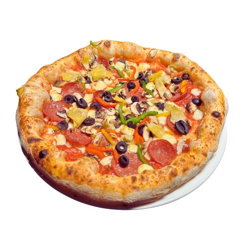 Tomato sauce with Mozzarella cheese topped with Fresh mushrooms, Artichoke, Salami, Olives, Bell Peppers and Oregano