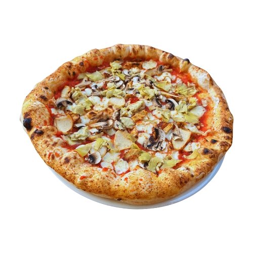 Tomato sauce and mozzarella, grilled chicken, artichoke, and mushroom
